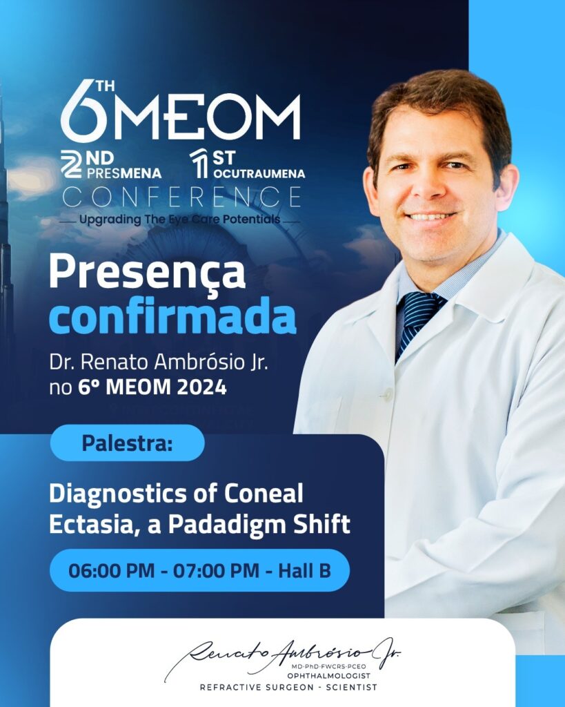 O doutor Renato Ambrósio Júnior participou com palestra online no 6th Middle East Ophtalmoly Meeting, que esta acontecendo de 3 a 5 de outubro de 2024, em Dubai, Emirados Arabes Unidos. Confira a agenda completa do doutor Renato Ambrósio Júnior durante o evento!